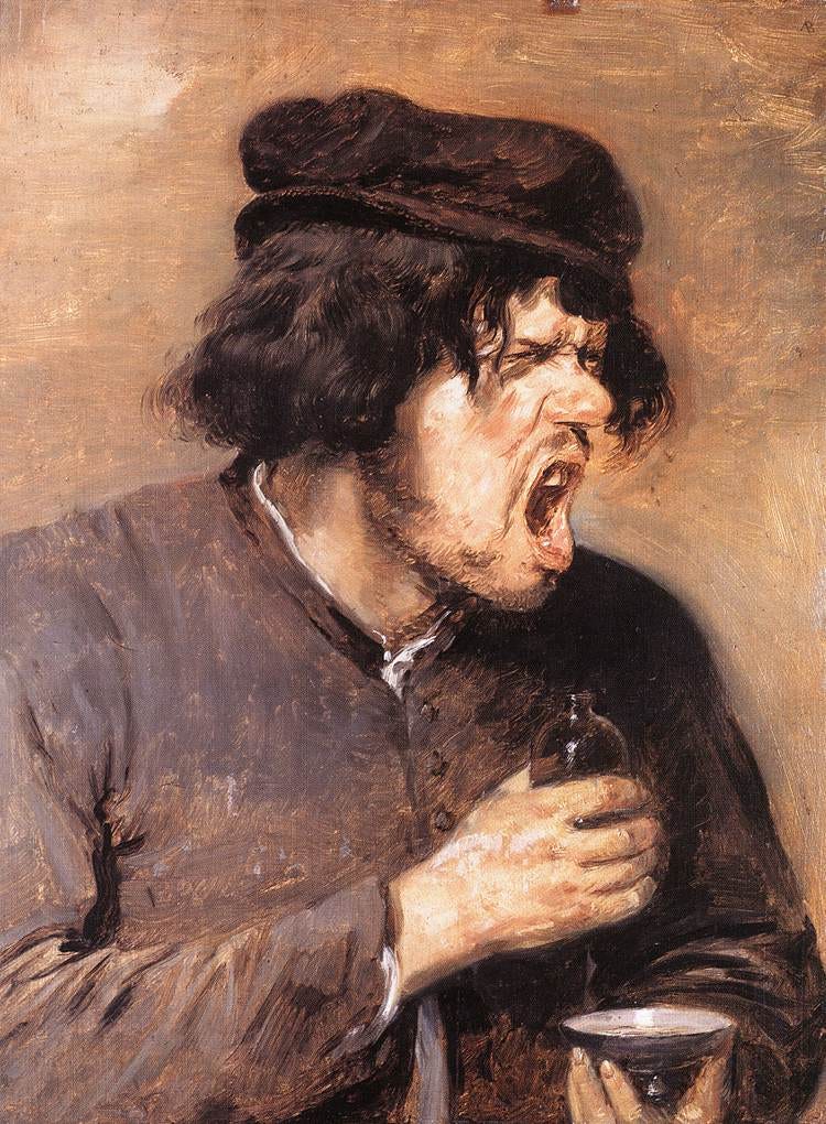 Joos van Craesbeeck was something of a specialist in portraying smokers. Nearly a quarter of his surviving paintings involve a smoker, or a scene in a smoke-filled room. The fellow in this painting is smoking a pipe but seems to be clutching the bottle with much more resolve.
